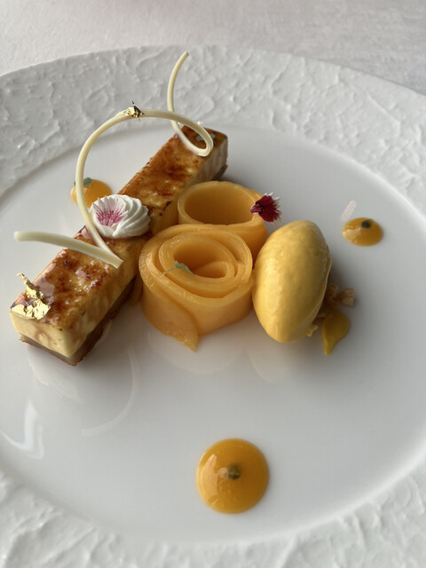 デザートはパッションフルーツとオレンジのシブーストに、生マンゴーとマンゴーのソルベ。レモンティーは柔らかく、上品だけれど、しっかりと香りが立って好みでした。