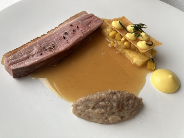 メインは燻した京鴨肉のロティ。藁を敷いたストウブ鍋に乗って出てきて、蓋を取った瞬間に藁の香りが漂ってきました。厚みがあって、ジューシーです。鴨のエキスを使ったソースも良く、パンでしっかり味わいました。コーンの付け合わせも凝っていて、甘くて新鮮でした。