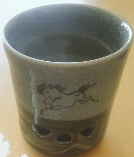「相馬あられ」も黒豆の香りがスーパーに売ってるような黒豆せんべいとは違い香りがよくいっぱい入ってて、パッケージと似た馬の「相馬焼き」の湯呑みがあったので、お気に入りでしまっていたけど我慢できず一緒にお茶をいれておやつタイムを楽しみました"(ノ*>∀<)ノ