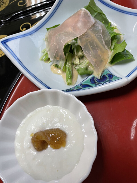 自家製赤紫蘇ゼリー、もって菊のおひたし、ハタハタの洋風天ぷら