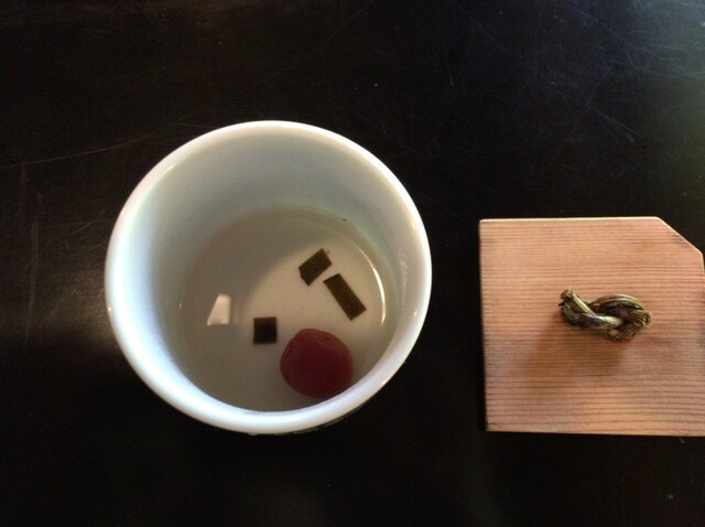 まずは夏なのでさっぱりと、朝の胃を目覚めさせてくれる梅昆布茶が出てきました。