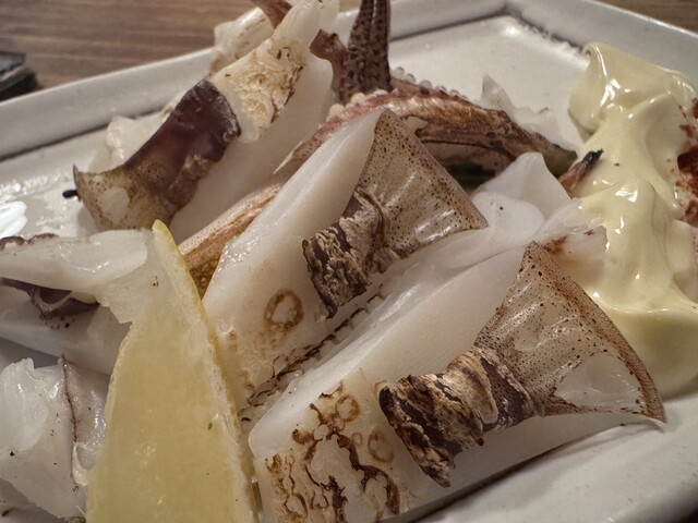 →生きたまま出してくださいました。コリコリツルツル、九州醤油が合います。最後は足のところを塩焼きか天ぷらにできたので、珍しいと思い塩焼きにして食べました。最高でした。