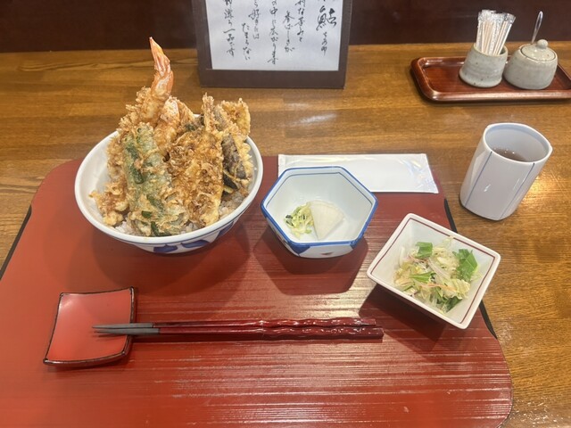 天丼ランチを注文。¥1,500。もう衣がサクサクで最高。タレも出汁が効いた甘めの味わいで、ご飯が進む事間違いなし。海老やナス、鱚など王道の天ぷらがモリモリで中々食べられない逸品でした。