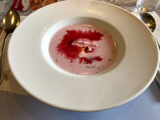 ピンク色のボルシチに感動!味はクリーミーで、皿の底にヨーグルトみたいなのが沈んでいて、いっしょにのんだらめっちゃ美味しい。