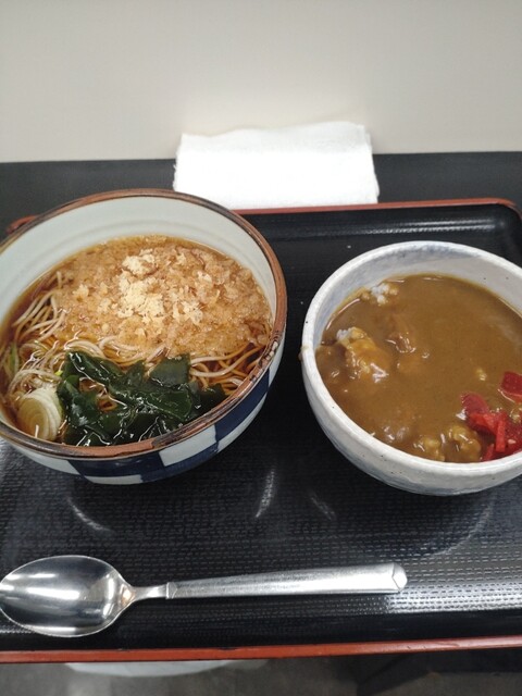 入口横にある看板メニューのたぬきそばとライスにしました!480円と150円です!
