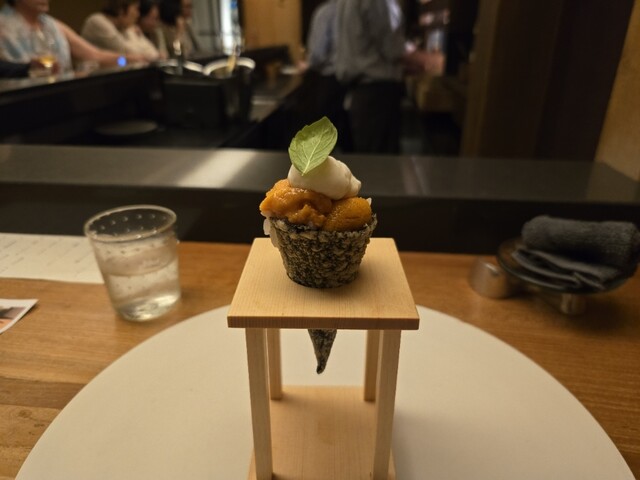 「寿司 雲丹」はアイスクリームのような形で出てきましたが、コーンの部分は海苔をクロワッサン形に巻いて素揚げにしたんだとか!