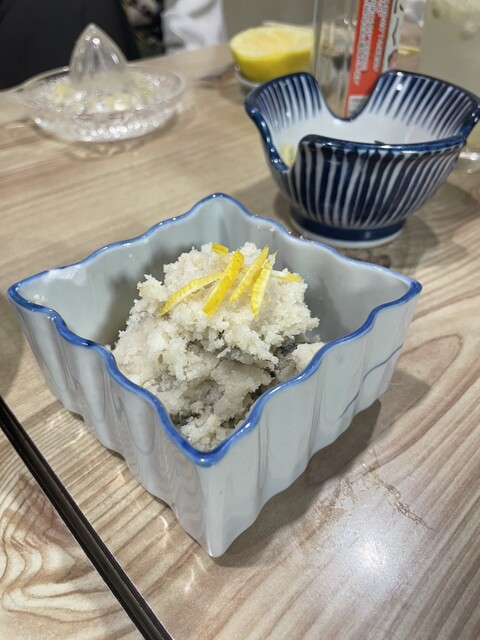 飲み物はかぼすサワーがおすすめだよ、ということでそちらを注文。半分に切ったかぼすがそのまま出てきて絞っていただきました!