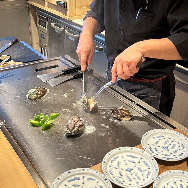 鮑のソテーは目の前の鉄板で焼き上げられるライブ感が最高。柔らかくプリッとした歯応えで、口いっぱいに鮑の旨みが広がります。バター醤油の香りも確定の美味しさ!