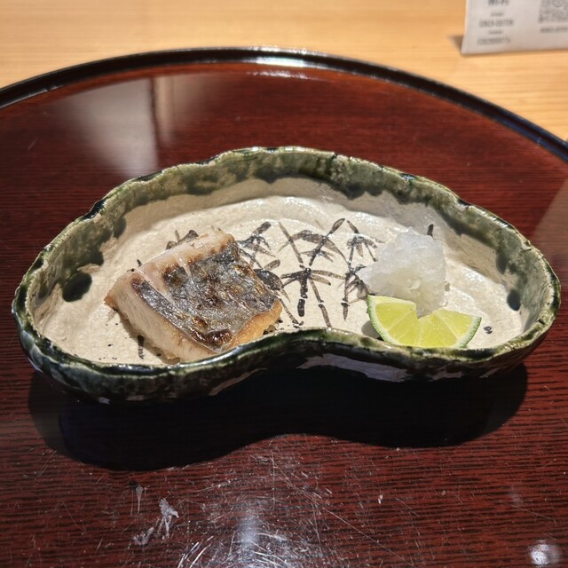 イサキはぎゅっとした歯応えがで、噛めば噛むほど旨みが広がります。皮目がパリッと焼かれ、身は脂なっていて魚の旨みが強い。すだちと大根おろしをかけるとさっぱりとまた違った味わいに。