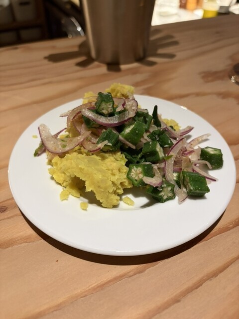 黄色いポテトサラダの上に、オクラとレッドオニオンがたっぷり。名前の通りスパイスが効いていて、これがナチュラルワインのアテとして最高に合います!