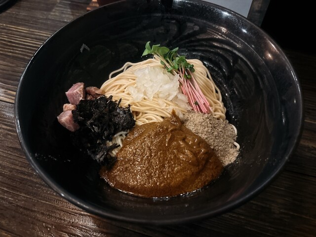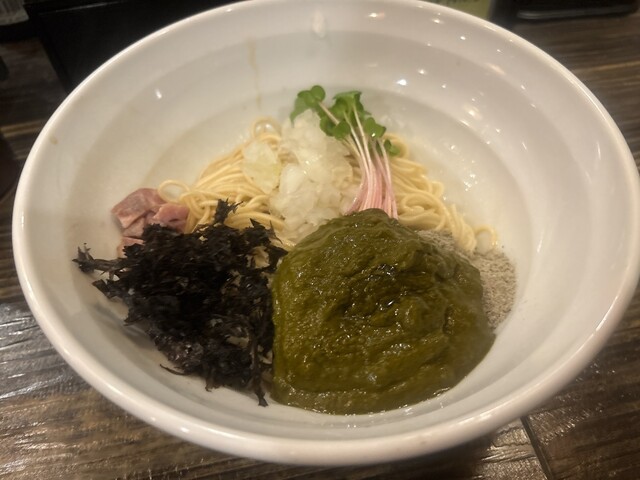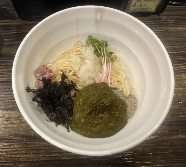 抜群のタイミングで和え玉のお声がけをいただきました。イカワタの肝ペースト、刻みチャーシュー&タマネギ、カイワレ、岩海苔、魚粉が敷き詰められたビジュアル。