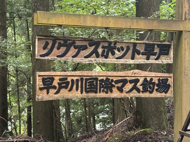 山の中を上り、「通り過ぎたか?」と思った頃に目的の『早戸川国際マス釣場』の看板を発見。