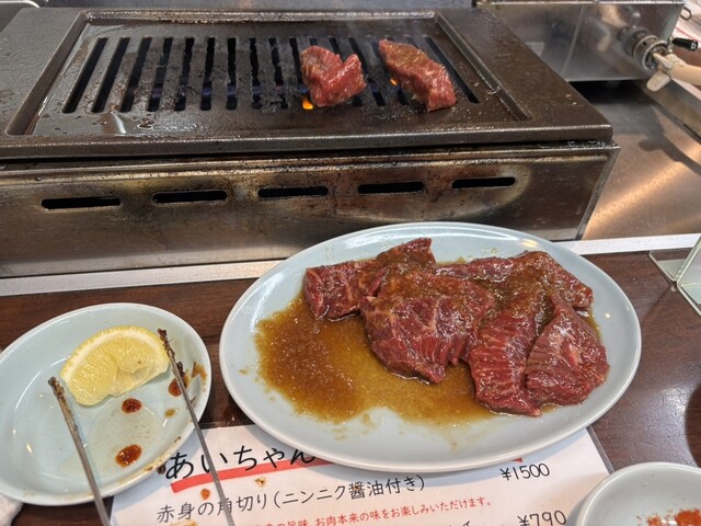 大倉山駅前にある焼肉家あいちゃん、人気店なので予約して日曜日の17:30に来店。カウンター席だけのお店で当然のように満席、予約しないと中々厳しいかと思われる。お店は女性二人でまわしています。まずはドリンクを注文するとメガを勧められます。女性二人で一人は注文受けてからお肉を切って味付けしているので忙しそうなのでメガが確かに良いかと思いました。