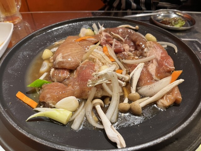 漬け込まれた骨付きの豚カルビをたっぷりのおつゆで煮込みながら食べるお料理。そこまで甘くないけど辛味もあって、味濃いめ。