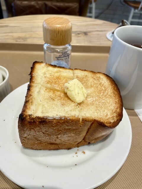 モーニングが終わるギリギリに行ったせいかトーストのパンがすごく分厚かったです。パンは少し甘味があります。