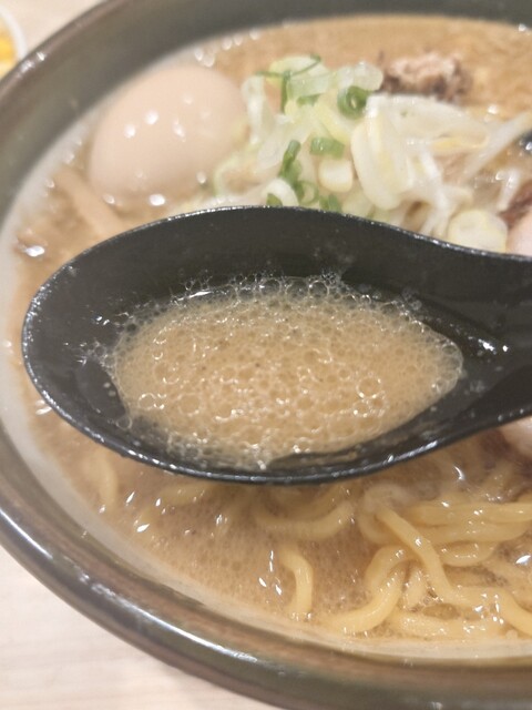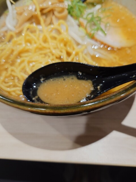 席で待つこと10分程で着丼です。スープは透明なラードの層で覆われていてアツアツ、保温だけでなくまろやかさとコクも増しています。塩味と甘味のバランスが取れた味噌には仄かに苦味も感じられ、良いアクセントとなっています。