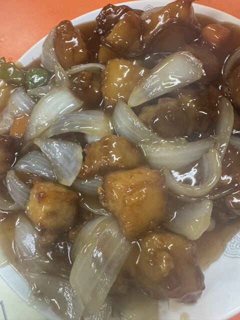 餃子、唐揚げ、酢豚、麻婆豆腐、天津飯、海老入り卵あんかけを注文、餃子は薄皮でジューシー、唐揚げは評判通りに大量で酢醤油、塩こしょうで