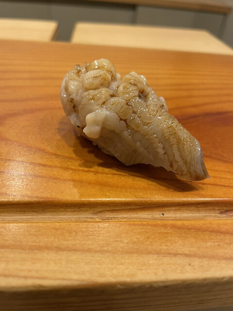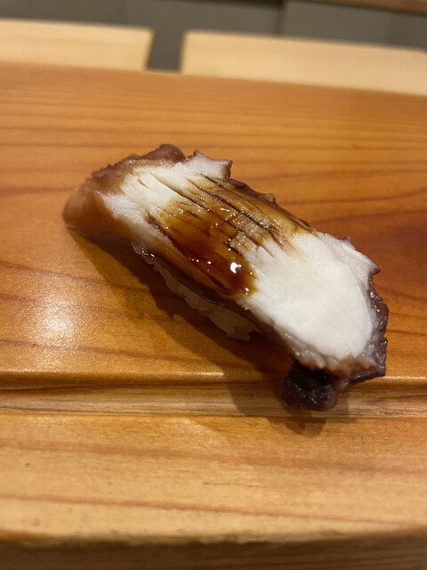 正確で美しい握り全体のフォルム、キレの中にどこか嫋やかさを感じる粒の大きいシャリ、サラリとした甘ったるさとは無縁のツメ、口に運んだ際のネタとシャリの口にしっとりと張り付くような上品さ、どれをとっても素晴らしく、食べ終わったあとの食後感も爽快。