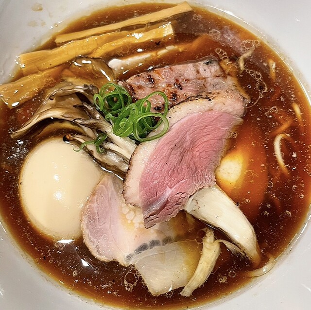 4種の地鶏を贅沢に使用した無化調スープは奥行のあるキリッとまとまりのある味わい、美味しすぎるー!提供スピードが早いのにスープがアツアツなのも素晴らしい。麺は自家製の中細ストレートで歯切れ良く心地のいい柔らかさ。醤油スープとよく絡んでめちゃくちゃ美味しい。チャーシューは豪華に4種で中でも鴨ロースが感動的で追加注文したい。トッピングには珍しい舞茸の素揚げは素材の旨みが凝縮されていてもはや料亭の料理。味玉はスープの邪魔をしない控えめな味付け。コリっとしたメンマも抜かりなくスープまで美味しく完飲完食。