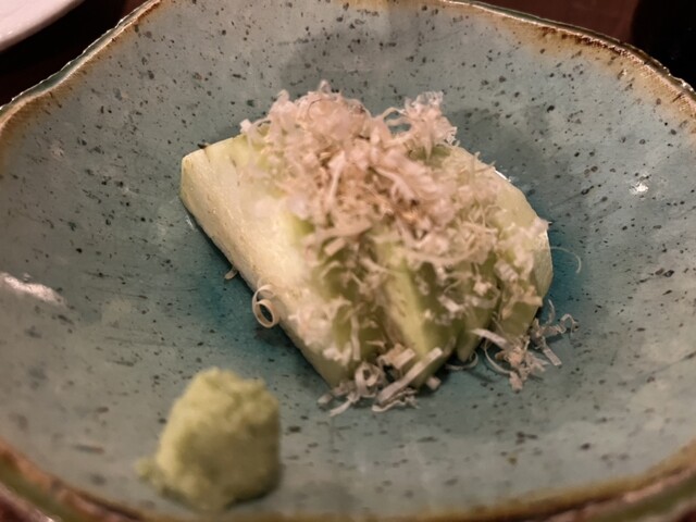 サッポロ赤星からスタート。まずおつまみを4種から選びますが、その4種が酒呑の心を奪います。沖縄もずくそうめん、群馬産黒枝豆、水茄子刺、フルーツトマト。旬の水茄子をチョイス。みずみずしい水茄子に鰹節、醤油ちょい付けで夏を感じます。