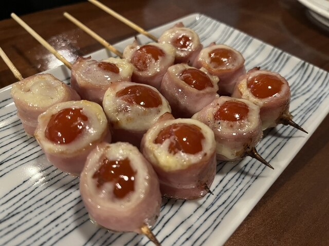 変わり種ではトマトベーコンチーズにタバスコをかけて楽しむ串。これも火の入れ方が絶妙で弾けるトマトの甘いこと!