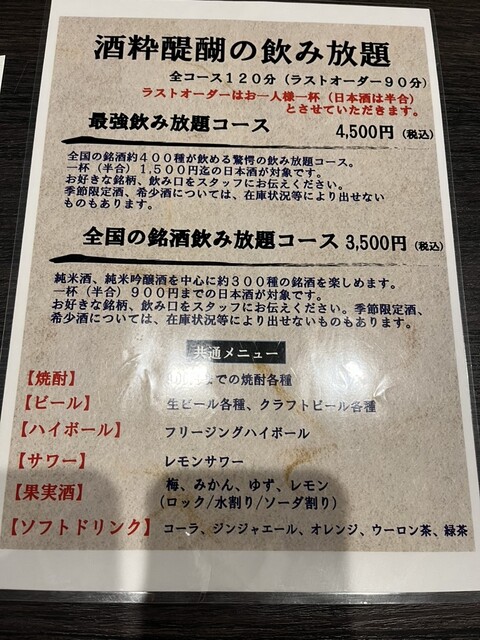 なんとこちらはアルコール飲み放題3500or4500円をチョイス、3500円なら日本酒300種、4500円ならレア酒含めて400種が飲み放題!リストも日本全国各地が揃えられ、それ以外にも月に20〜30は入れ替わっていくそうです。何て素晴らしいシステム。。