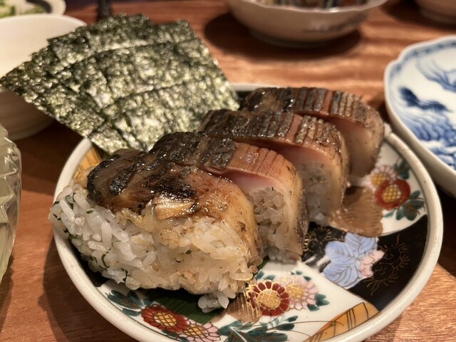 炙りサバ寿司は脂ノリノリのサバを炭火で炙り焼きにしたものを海苔巻きにして食べるスタイル。口の中で香ばしさにまみれながら消えていきます。