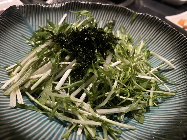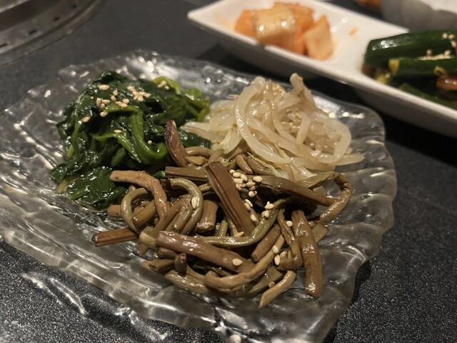 キムチ3種、ナムル、水菜のチョレギサラダ、すじ肉の塩煮の前菜と生ビールでまず乾杯!ここから怒涛の肉三昧が始まります。