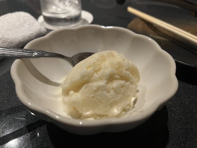 〆は香り豊かなガーリックライスで腹を満たし、桃のシャーベットでさっぱりと仕上げて終了!このフルコース、飲み放題付きで8000円は満足度高く、コスパ高いと思います。また来ること確定!
