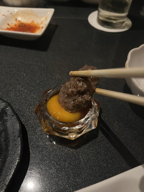 そして初めての焼肉屋のハンバーグが登場。その皿上の配列がこれまた圧巻!小俵ハンバーグは自分の好みに焼きつつ、卵黄、甘醤油、トリュフ三重奏のつけだれにダイブ!至福の上の至高に辿り着きます。