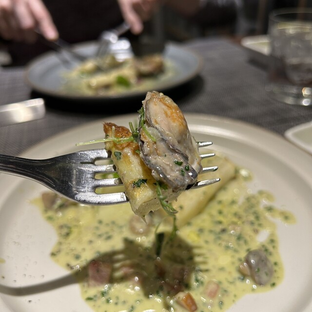 ホワイトアスパラと牡蠣のブルーギニヨンバター。