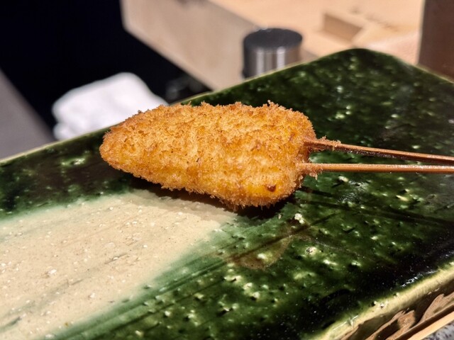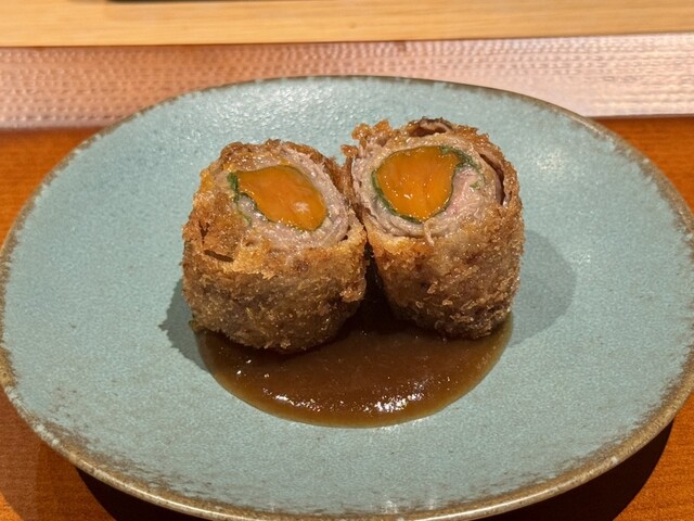 卵黄の黒毛和牛巻き(すき焼きソース) → 黒毛和牛で卵黄を巻いて揚げるという驚きの発想。粘度の高いすき焼きソースが絡み、卵黄と肉のコクが渾然一体となる贅沢な串。