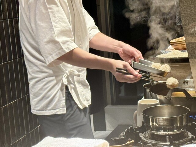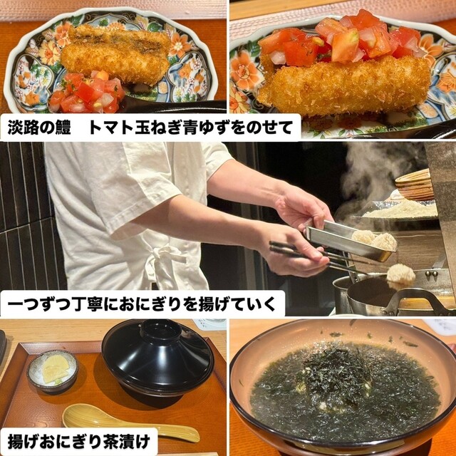 揚げおにぎり茶漬け → 香ばしく揚げたおにぎりを出汁茶漬けに仕立て、上から海苔をたっぷりと。サクッとした衣が出汁を吸い、食感と旨みが一体化。〆にふさわしい満足感。