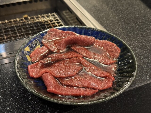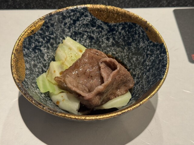 ミスジの焼きしゃぶ → 焼肉だれにキャベツを合わせていただくスタイル。甘めのタレとキャベツの食感が肉と一体化して、思わず唸るうまさ。