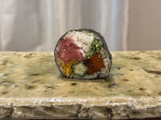 とろ・ボイルオクラ・出汁醤油などを太巻きに。