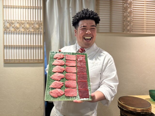 赤酢のシャリで握り、霜降り大トロ、赤身、中トロを一貫ずつ楽しめる。鮪本来の甘味と旨味が存分に味わえる。