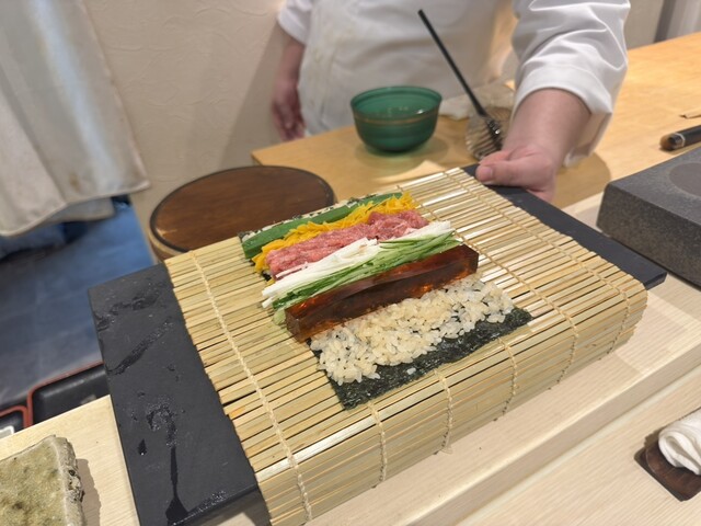 山形の出汁で和えた刻み野菜の上に雲丹を乗せ、シャリで巻く一品。雲丹の濃厚な甘味と野菜のさっぱり感が見事に調和し、最初の一口から食欲を刺激する。