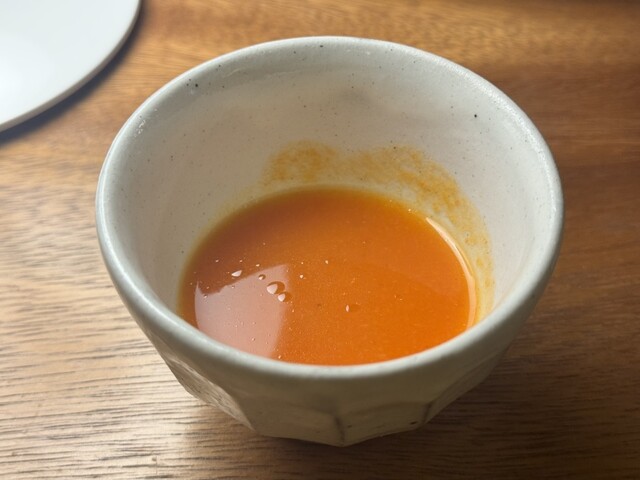 金時人参の燻製スープは香りが印象的で、コースの流れに変化をもたらす一杯。
