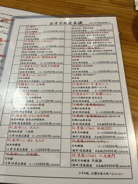 カウンター席に案内され、どういうメニューがあるかなあ、と思いながら卓上のメニューを見るとかなり豊富な種類があります お刺身の種類も多いですが、貝の浜焼きや旬のお魚など これはテンション上がりますね とりあえず生ビールを注文しつつ、大好物の稚鮎の唐揚げ、珍味3種でいただきます 稚鮎の唐揚げは淡白な白身とほろ苦な内臓がマッチして美味しかったです 続いて本ししゃもと刺身5種盛りをいただきました 刺身は特に中トロが肉厚で身が大きく程よい脂の乗りで格別でした お酒は今まで飲んだことなかったのですが、サッポロの氷彩サワーをいただきます まったく甘くなくやや酸味があり和食によく合うと思います その後、せっかくなのでホンビノス貝の浜焼きもいただきました 日本酒は店員さんにメニュー表をいただくとかなり豊富なメニューです 定番なものからレアなものまであります 今回は夏っぽくカブトムシと七賢の夏酒をいただきました どちらも和食とバッチリです 〆のメニューもお鮨やご飯ものだけでなく担々麺などもあり魅力的でしたが、お腹もほどよい感じで満足していたのでここまでにしました ごちそうさまでした