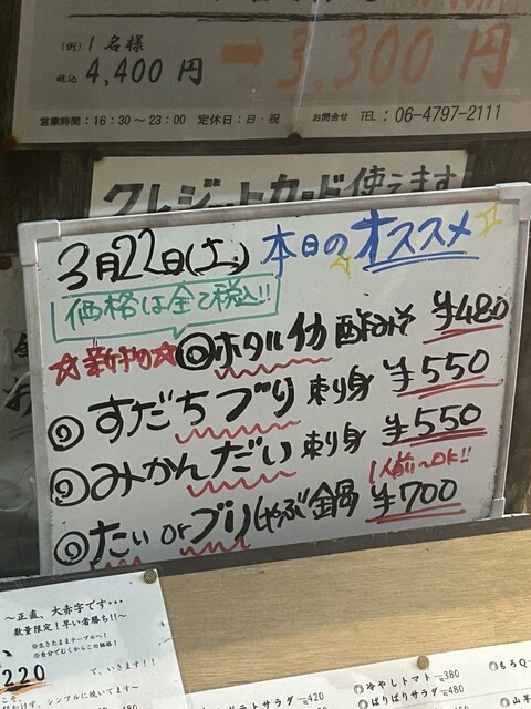 すだち鰤、ひらめ、みかん鯛造り 550円