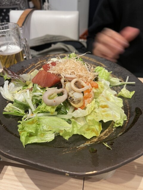 天然本まぐろの刺身は脂と赤身のバランスがよく、一切れごとに旨味が広がります。サラダの漬けまぐろもさっぱりとした味付けで箸が進みました。