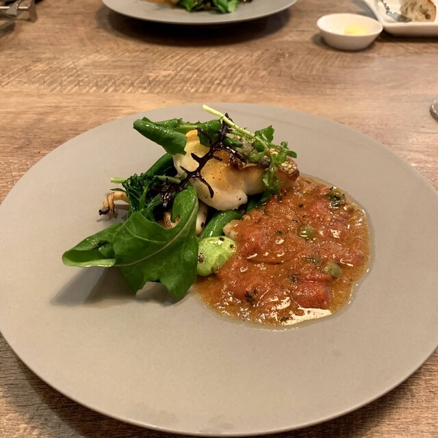 前菜のサラダはフルーツと鴨肉が入っておりドレッシングも美味しく