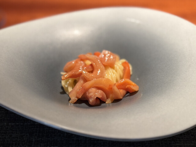 今回のハイライトはアコヤ貝とキャビアの冷製フェデリーニ。