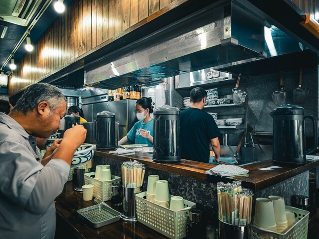 昼ピークは過ぎてるはずなのに、店前には数人待ち。でもここ、誰かが食べ終わる→すぐ食券→すぐ提供の流れが早すぎて、並んでる時間すら会話してたら一瞬で溶けた。百名店でこの回転、一番の衝撃かもしれない。