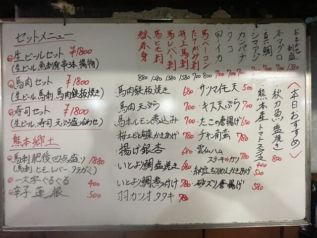 せっかくなので地元熊本の焼酎と、馬料理をいくつか注文
