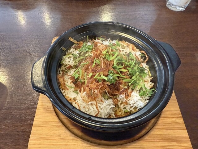 珍しい牛すじのビリヤニがあったので注文。味は濃すぎず、量もちょうど良い。ビリヤニは土鍋で調理されており、石焼ピビンパみたいにおこげも楽しめます。