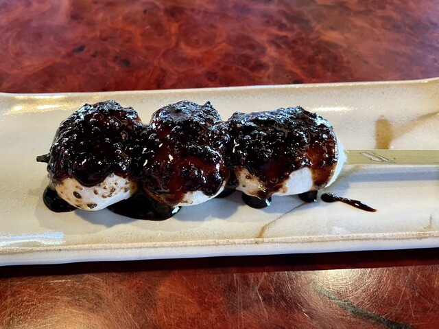 おまけで頼んだ名物だんごは温かく、味噌がたっぷりかかった素朴な田舎のおやつ感覚。だんごというより、つきたてのお餅のような食感で、蕎麦後のデザートに最高。