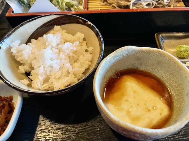 (もりそば、山菜てんぷら、ゆばさし、麦めしとろろ)