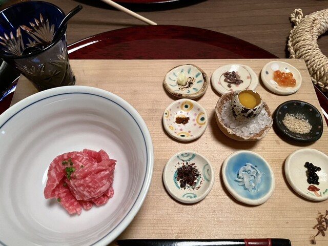 メインは近江牛のひつまぶし。赤身でも柔らかで、ほどよい噛みごたえもある近江牛。そのままで食べてももちろん美味しいが、肉刺し、ユッケ、炭火焼肉、土鍋ご飯にかけて出汁茶漬け…と様々なバリエーションで堪能させていただいた。