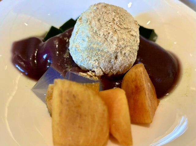 お福あんみつは、寒天と抹茶ゼリーに季節のフルーツ(今回は柿)とこだわりの餡、お福包み餅、きなこを合わせたもの。濃厚な黒蜜をからめ、塩金平糖と、アンデス岩塩をアクセントにいただく。